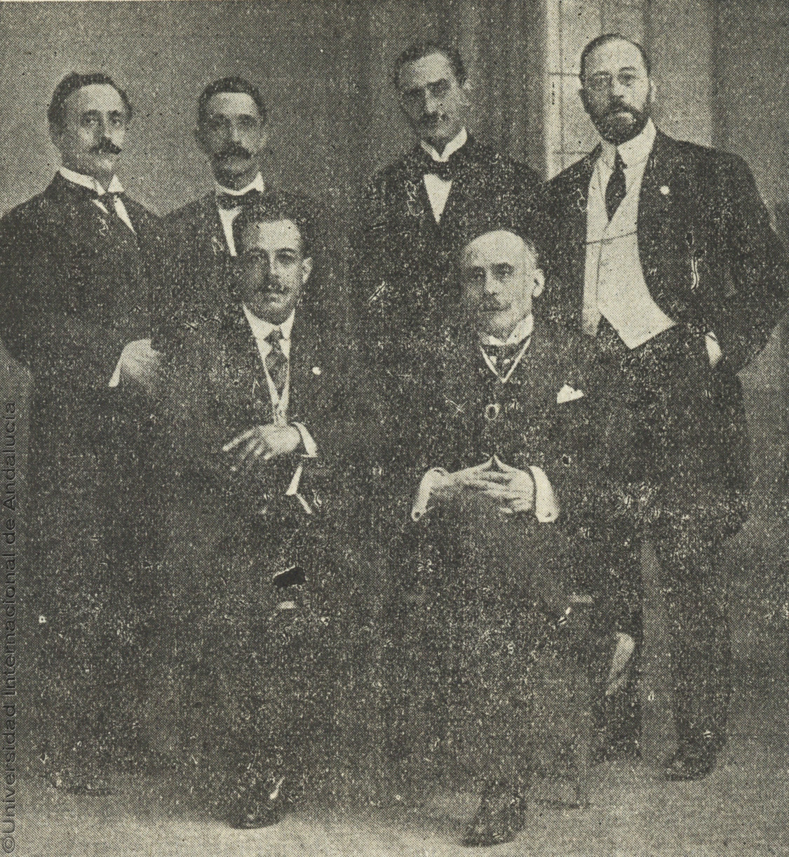 Pie de foto: El Presidente de la Colombina (X) Sr. Marchena Colombo; el Catedrático (1) Dr. D. Rodolfo Reyes; el Alcalde de Huelva (3) D. Pedro Garrido Perelló; el Presidente de la Comisión de Fiestas del Ayuntamiento (4) D. Antonio Morano; el Presidente de la Comisión organizadora de los festejos colombinos (5) D. Ricardo Terrades Plá, y el Secretario de la Corporación Municipal (6) D. Manuel Garrido Perelló, a cuya actividad y celo se debe la brillantez de los actos Colombinos
