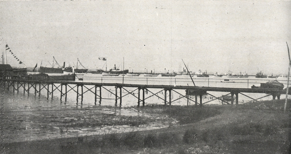 Pie de foto: Buques mercantes y Tarrafas pescadoras de Huelva, Ayamonte e Isla Cristina, esperando el paso de escuadrilla que condujo al Rey a La Rábida.
