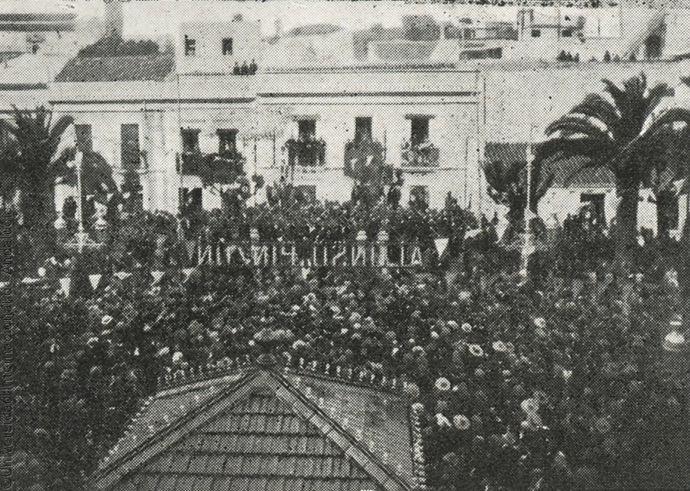 Pie de foto: Huelva, los obreros entregan el Martillo de oro a Rada en la Plaza de las Monjas