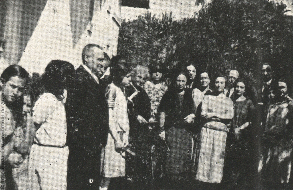 Pie de foto: El Inspector de 1ra. Enseñanza, Sr. Siles, y un grupo de maestras, 12 de octubre