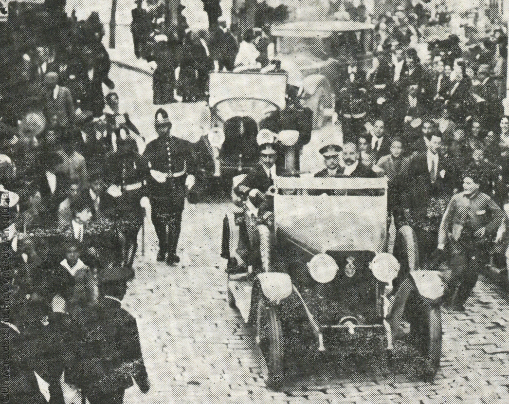 Pie de foto: Huelva, el Rey acompañado del Ministro de Marina y el Alcalde de la ciudad, seguido del pueblo que lo vitorea