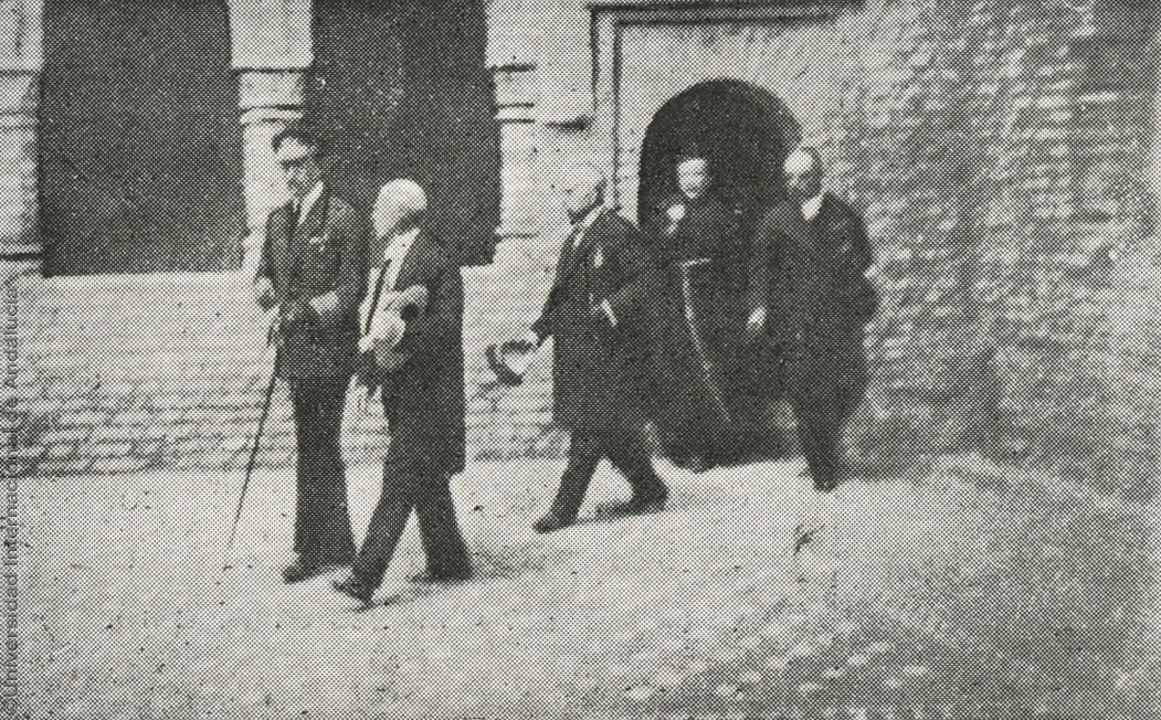 Pie de foto: La Rábida, D. Alfonso entrando en el patio con el Presidente de la Colombina y seguidos del Gobernador, antes de empezar la sesión