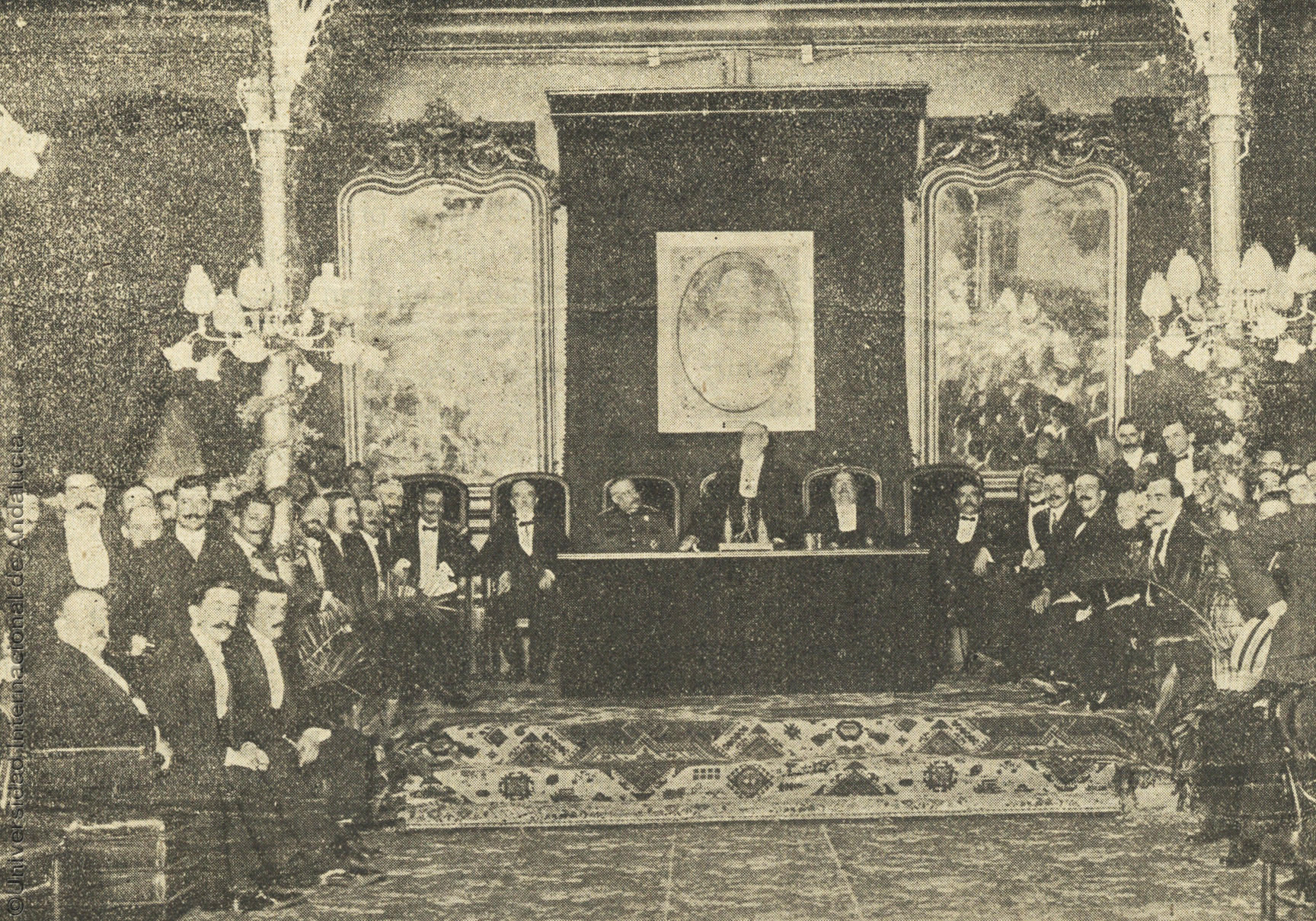 Pie de foto: Aspecto del estrado presidencial en la Junta celebrada en el Círculo Mercantil. En la presidencia, el Sr. Rafael M. de Labra pronunciando su discurso de toma de posesión de la Presidencia Honoraria de la Sociedad Colombina