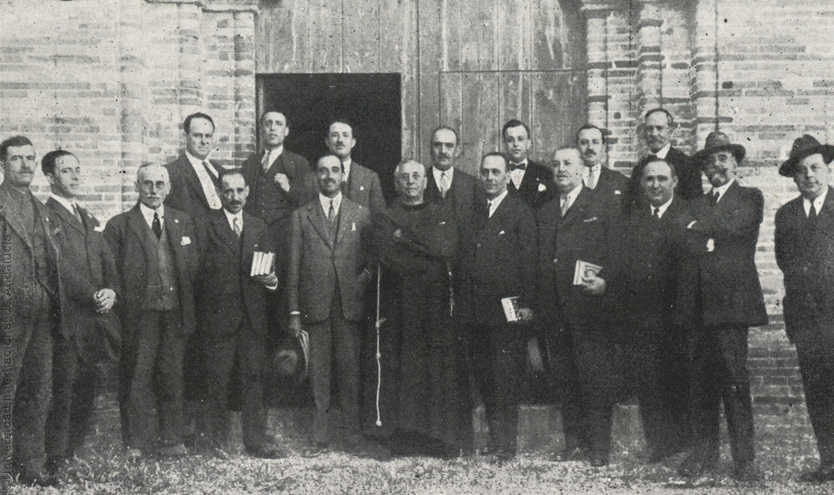 Pie de foto: La Asociación General de Empleados y Obreros de Ferrocarriles, Zona 23, que es la correspondiente a Huelva, obsequió con una excursión al Monasterio de La Rábida a la comisión venida de Madrid. El Presidente de la Colombina acompañó a los excursionistas, pasándose una tarde admirable. En esa intimidad que da la aspiración y el trabajo en común, obreros de la inteligencia y manuales sintieron la patria que todos queremos engrandecer