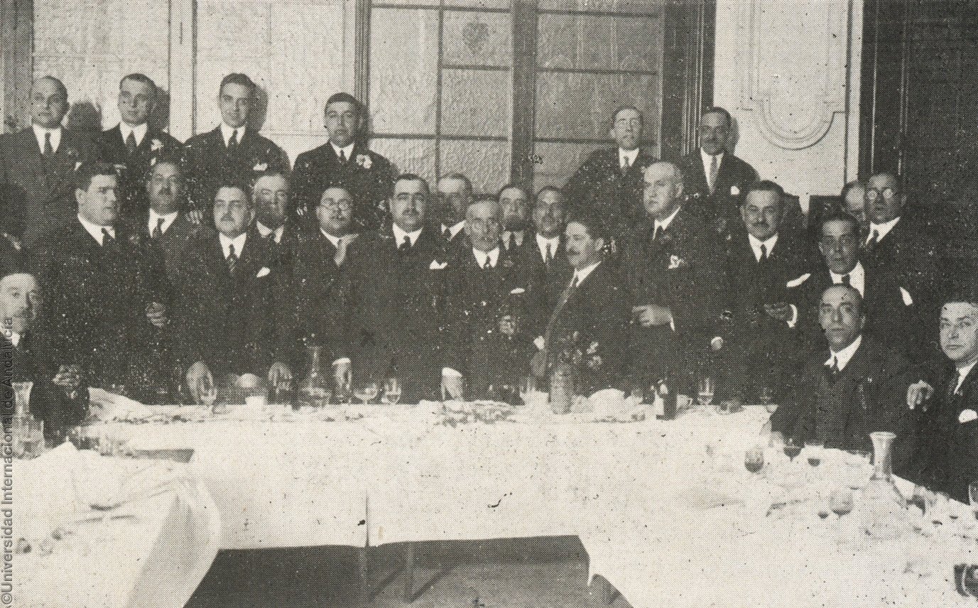 Pie de foto: El Centro Mercantil de Sevilla ofreció a D. César Alba por su tercera reelección de Presidente, un banquete de más de 300 cubiertos, teniendo que limitar el número por no caber en el local. En el grabado está el Presidente rodeado de la nueva Junta y de los que presidieron el acto