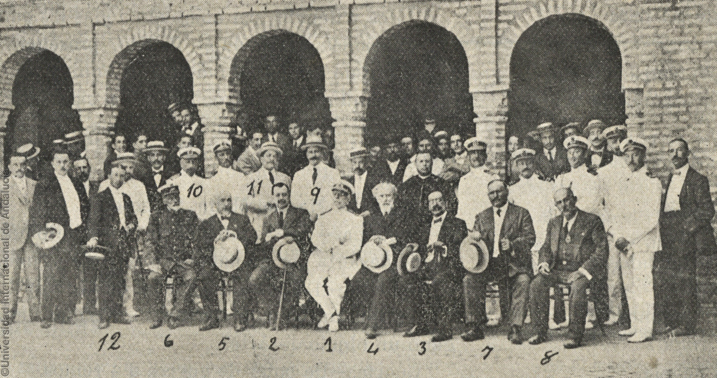 Pie de foto: Las autoridades y los Colombinos en La Rábida la mañana del 3 de agosto. Comandante General, 1; Sr. García Kolhy, 2; Gobernador Civil, 3; Excmo. Sr. D. Ricardo Velásquez, 4; Presidente de la Audiencia, 5; Gobernador Militar, 6; Alcalde de Palos, 7; D. Juan Cádiz Serrano, Vice-presidente de la Colombina, 8; Redactor del Diario de la Marina de la Habana, 9; Comandante de Marina, 10; Sr. Hernández Pinzón, 11; Segundo Secretario de la Colombina, 12