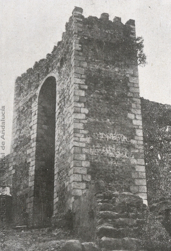 Pie de foto: Cumbres Mayores, Huelva, puerta de su castillo declarado monumento nacional