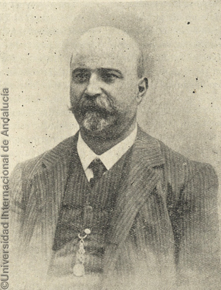 Pie de foto: D. Diego Quintero, Secretario del Ayuntamiento de Gibraleón, decidido protector de la cultura y uno de los más entusiastas campeones de las conferencias que se han dado en dicho pueblo